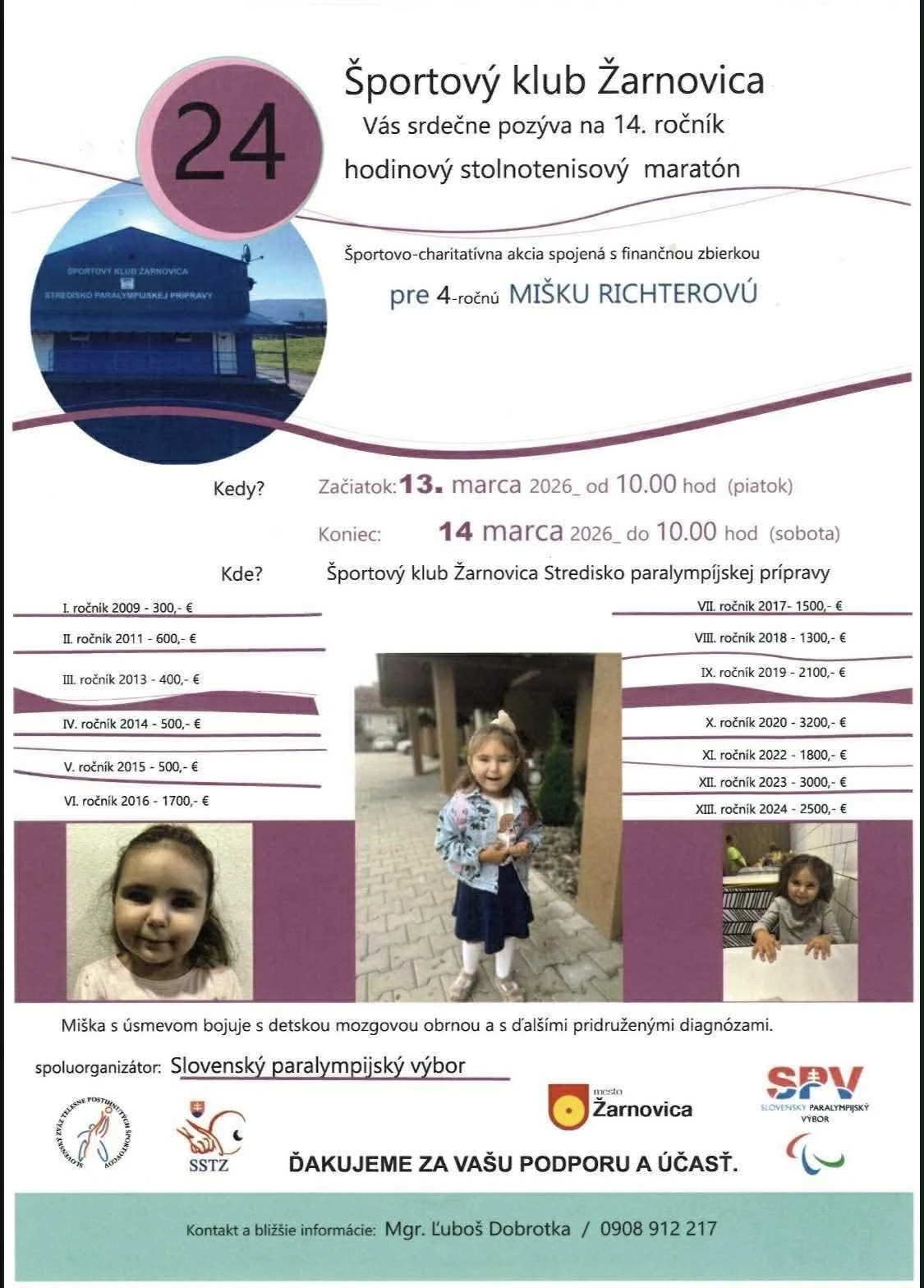 Primátorka mesta Žarnovica vo svojom pozvaní vyzýva obyvateľov, aby sa zapojili: „Už o pár týždňov môžete svojou účasťou podporiť 24-hodinový stolnotenisový maratón a tiež finančne prispieť malej Miške na liečbu. V mene rodiny Richterovej ďakujeme.“ Zároveň prosí verejnosť o zdieľanie informácie, aby sa o podujatí dozvedelo čo najviac ľudí.