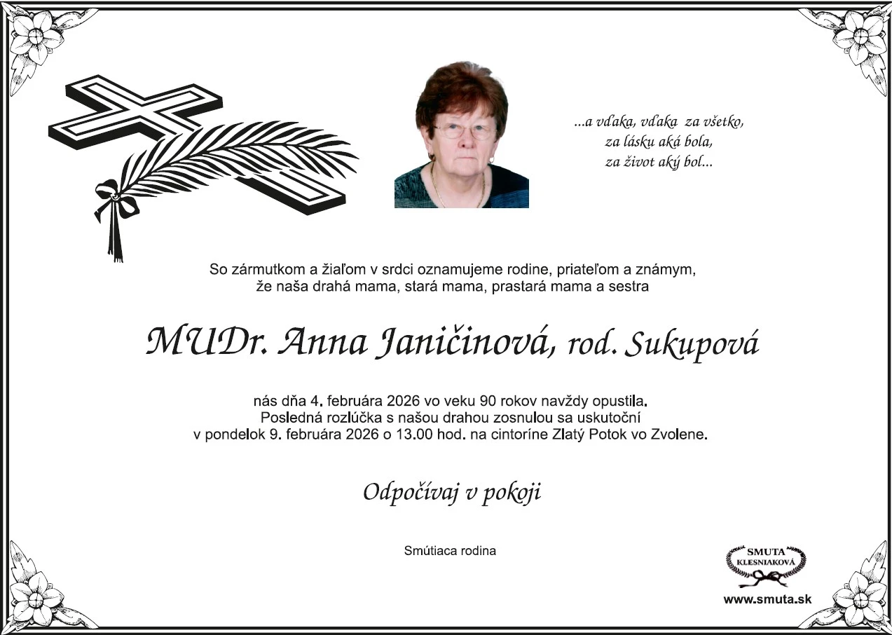 V srdciach mnohých rodín zostane doktorka Anna Janičinová navždy zapísaná ako lekárka s veľkým srdcom, ktorá svoju prácu nevnímala len ako povolanie, ale ako poslanie. Posledná rozlúčka sa uskutoční v pondelok 9. februára o 13:00 hod. na cintoríne Zlatý Potok vo Zvolene.