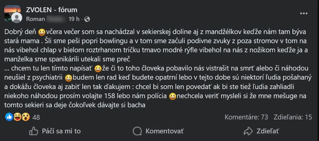 „V pondelok večer som sa nachádzal v Sekierskej doline aj s manželkou, keďže nám tam býva stará mama. Šli sme pešo popri bowlingu a v tom sme začuli podivné zvuky. Spoza stromov v tom na nás výbehol chlap v bielom roztrhanom tričku, mal tmavomodré rifle a v ruke nôž. Keďže ja a manželka sme spanikárili, utiekli sme preč,“ opísal Roman na sociálnej sieti.