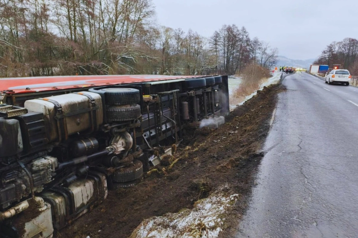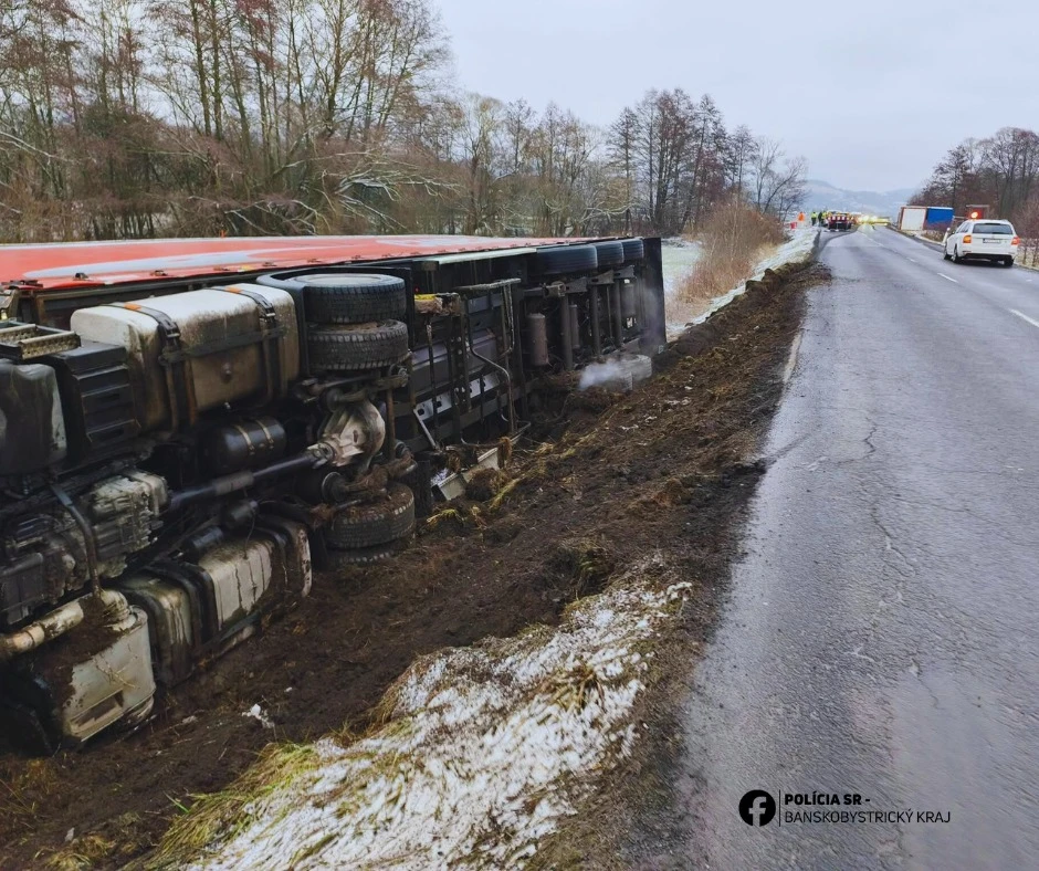 Neďaleko Detvy sa prevrátil kamión, doprava je obmedzená, počas vyťahovania úsek úplne uzavrú