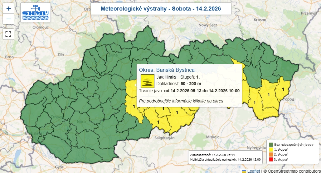 Vodiči by mali v sobotu 14. februára 2026 v ranných hodinách zbystriť pozornosť. Pre okresy Zvolen, Banská Bystrica, Brezno, Detva, Lučenec, Poltár, Revúca a Rimavská Sobota platí výstraha prvého stupňa pred hmlou.