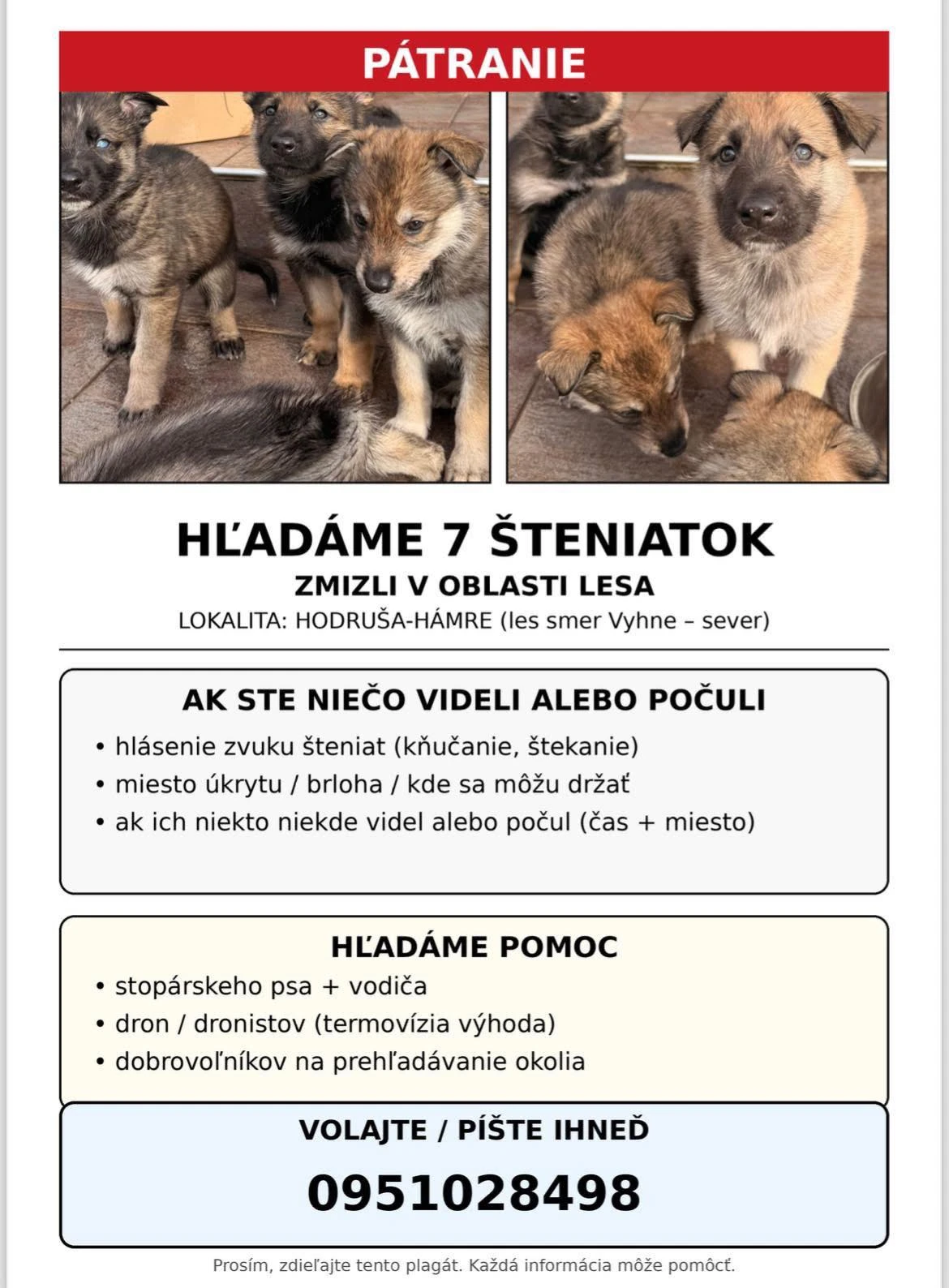 Ak niekto počul kňučanie alebo štekanie, prípadne si všimol možné miesto úkrytu (brloh, hustý porast) alebo má akúkoľvek informáciu o pohybe šteniatok, môže kontaktovať organizátorov pátrania. „Prosím, zdieľajte tento plagát. Každá informácia môže pomôcť,“ apelujú organizátori.