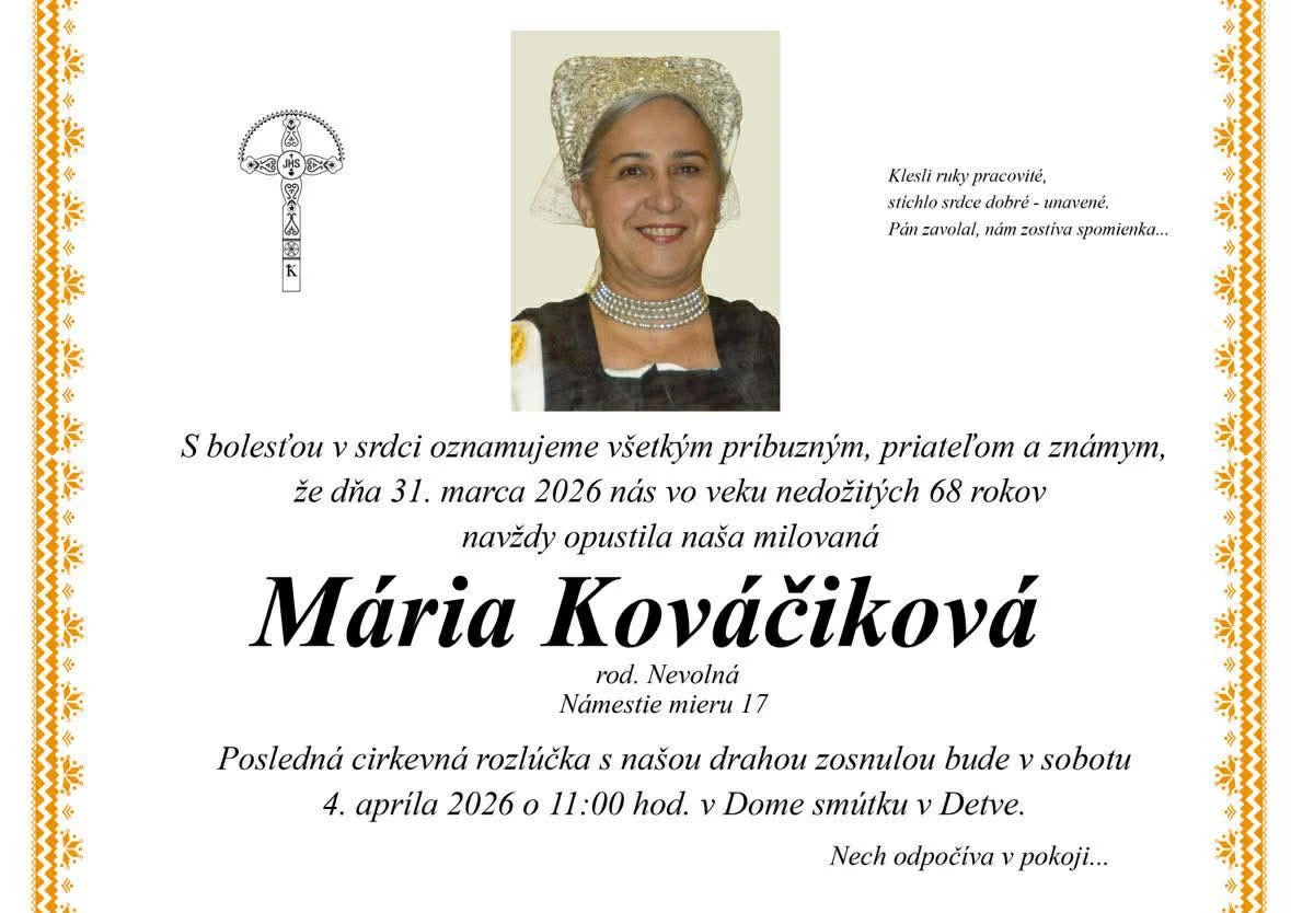 Folklórny súbor Podpoľanec z Detvy oznámil smutnú správu o úmrtí bývalej tanečníčky a krojárky Márie Kováčikovej vo veku 67 rokov. Posledná rozlúčka so zosnulou sa uskutoční 4. apríla v Dome smútku v Detve o 11:00.