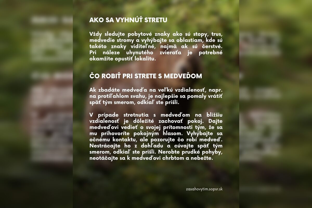„Súčasťou webu sú aj praktické informácie o bezpečnom pohybe v prírode a preventívne opatrenia na ochranu života, zdravia a majetku, ako aj odporúčania, ako sa správať v oblastiach s výskytom medveďa hnedého, a tým predchádzať nebezpečným situáciám,“ uviedol generálny riaditeľ štátnej ochrany prírody Roman Fajth.