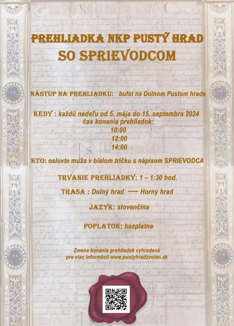 V tejto turistickej sezóne turisti, ktorí sa vyberú na Zvolenský Pustý hrad v nedeľu, môžu využiť služby bezplatného sprievodcu. Stretnú sa s ním v bufete pri Dolnom hrade a spoznajú ho podľa bieleho trička s výrazným nápisom SPRIEVODCA. Prví záujemcovia mohli využiť jeho služby už 5. mája. Začiatok prechádzky po Dolnom i Hornom hrade sú o 10:00, 12:00 a 14:00 hod. Prehliadka trvá asi jeden a pol hodiny. Posledná nedeľa so sprievodcom po Pustom hrade sa uskutoční 15. septembra.