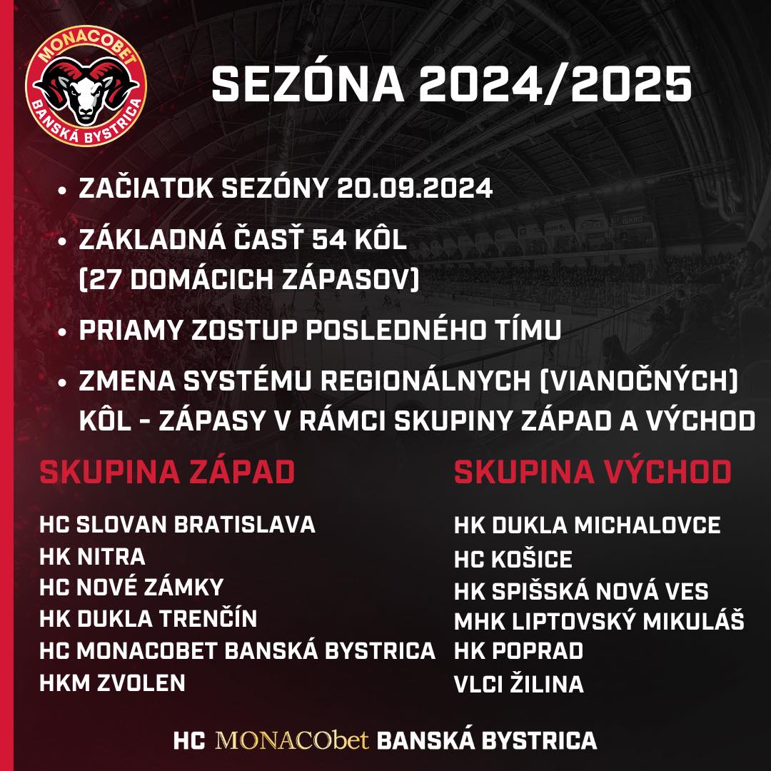 Hokejový klub HC MONACObet Banská Bystrica informoval fanúšikov, že nová sezóna so sebou prinesie aj viaceré novinky. Ako píše na sociálnej sieti, liga za začne 20. septembra. Na hokejistov čaká 54 kôl a Banskobystričania sa môžu tešiť na 27 domácich zápasov v základnej časti.