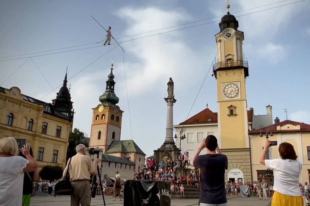 VIDEO: Ponad banskobystrickým námestím prešiel nemecký povrazochodec. Ľudia boli uchvátení