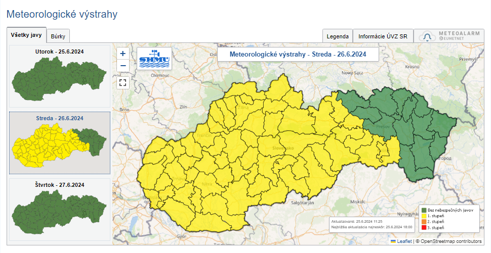 V stredu očakávajte silné dažde a búrky. Meteorologický ústav vydal 1. stupeň výstrah