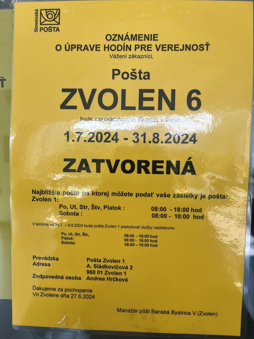 Vo Zvolene bude počas leta zavretá pobočka Slovenskej pošty, ktorá sa nachádza na Pražskej ulici. V oznámení priamo na pobočke Zvolen 6 sa píše, že nebude fungovať od 1.7. až do 31.8. z prevádzkových dôvodov.