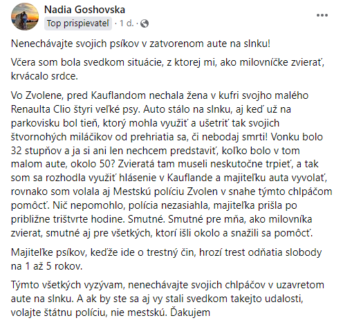 Gajdoš ďalej ujasnil, že informácie od obyvateľky Zvolena, ktorá zdieľala príspevok na sociálnej sieti neboli pravdivé. „Nakoľko sa jednalo o večerné hodiny, vozidlo nebolo na priamom slnku, psy mali dostatok čerstvého vzduchu z otvoreného okna zadných dverí a hliadka Mestskej polície sa na miesto dostavila a celú vec preverila,“ objasnil Gajdoš.