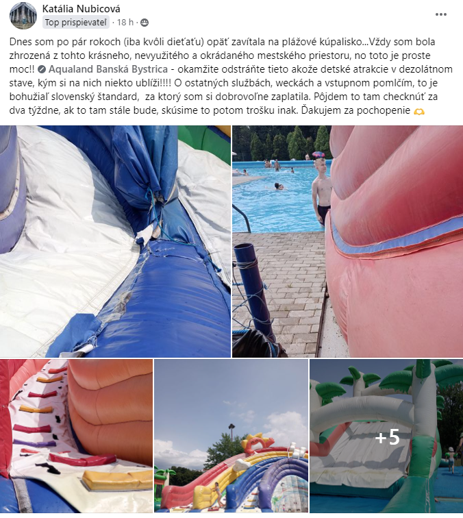 Na internete sa objavil príspevok nahnevanej návštevníčky Natálie, ktorá zdieľala fotografie zničených detských atrakcií, ktoré sa nachádzajú v Aqualand Banská Bystrica. „Okamžite odstráňte tieto akože detské atrakcie v dezolátnom stave, kým si na nich niekto ublíži,“ napísala v príspevku.
