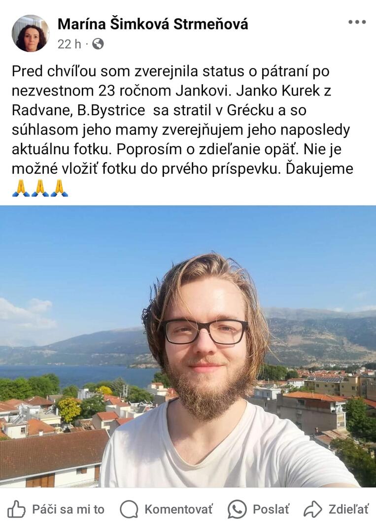 Marína Šimková Strmeňová na sociálnej sieti uviedla, že Ján Kurek sa stratil v Grécku a so súhlasom jeho matky zverejnila jeho aktuálnu fotografiu.