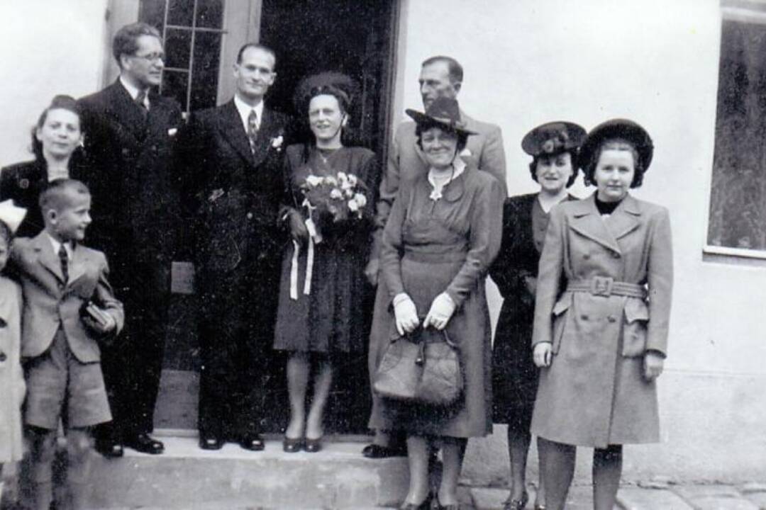 Sú na nej novomanželia Magdaléna a Arpád Vykysalí spolu so svadobnými svedkami a priateľmi pred takzvaným Drexlerovským domom. Svedkami na svadbe im boli práve manželia Adamčíkovci. Mladomanželia s nimi boli dobrí priatelia a manželia Adamčíkovci bývali u nich v podnájme práve v tomto dome. Svadba sa konala v roku 1942.