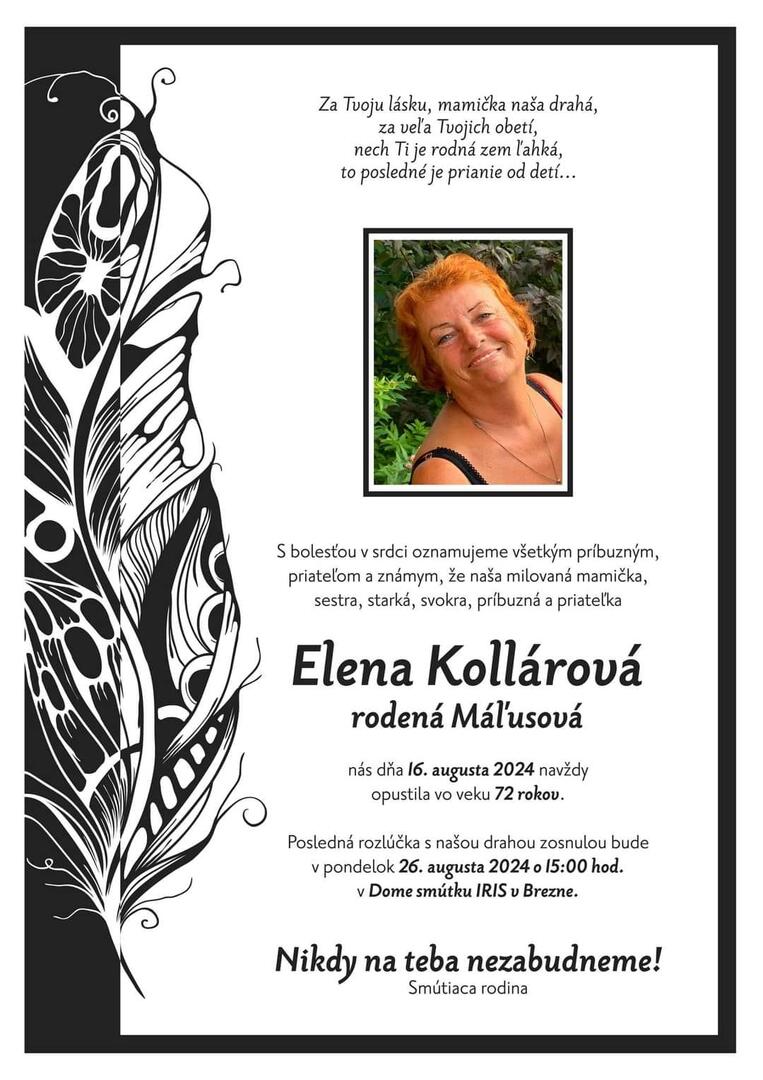 Mesto Brezno na sociálnej sieti informovalo o úmrtí pani Eleny Kollárovovej, ktorá našla celoživotnú záľubu v turistike. Neskôr sa z nej stala predsedníčka Klubu turistov TOMO a svoju vášeň odovzdávala aj ďalším generáciám.