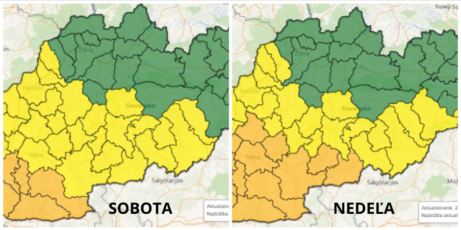 Teplota vzduchu sa počas víkendových dní bude pohybovať medzi 31 až 33 stupňami Celzia. Najvyššie teploty hrozia najmä v južných a stredných okresoch kraja. Banská Bystrica, Veľký Krtíš, Rimavská Sobota, Detva, Krupina, Poltár, Revúca sú mestá, ktoré spadajú pod výstrahu 1. stupňa.