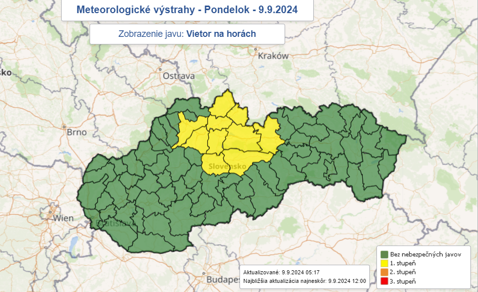 Slovenský hydrometeorologický ústav dnes upozorňuje najmä na silu vetra, ktorá dosiahne vysoké hodnoty. Na horách a vyššie položených obciach ako je Banská Bystrica a Brezno, sú vyhlásené výstrahy 1. stupňa. Vietor dosiahne silu 30 až 37 m/s, čo predstavuje silu 110 až 135 km/h.