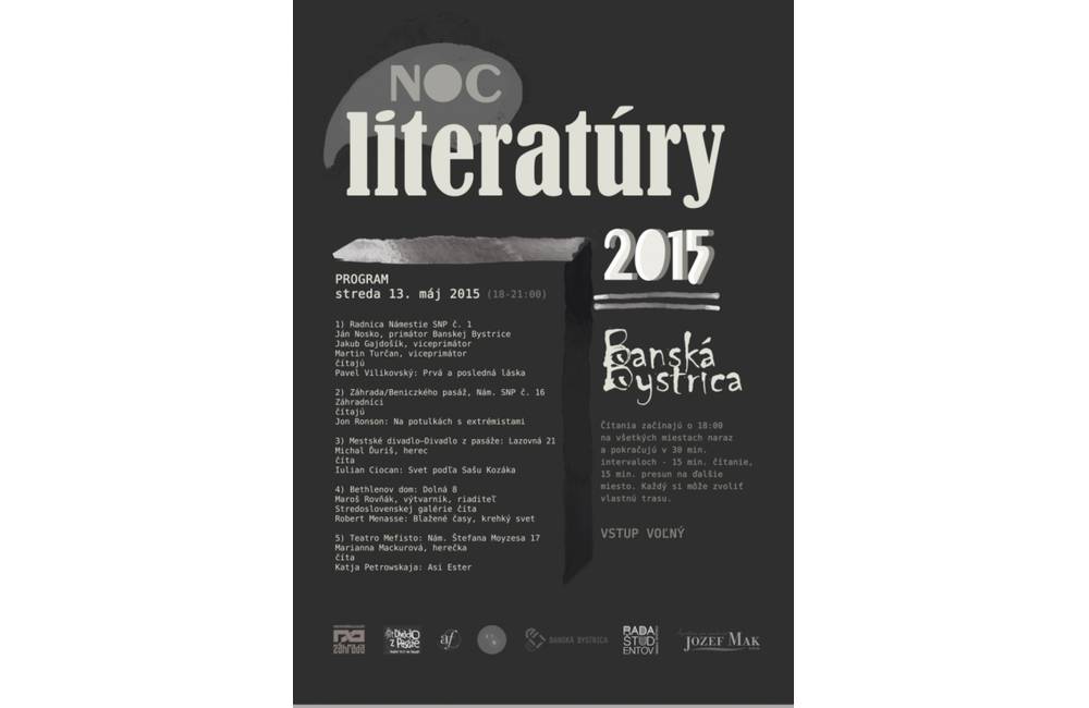 Radnica, Záhrada, Divadlo z Pasáže, Bethlenov dom i Teatro Mefisto. To je päť netradičných miest, ktoré sa budú tento rok spájať s obľúbeným podujatím Noc literatúry 2015. Tentokrát neposlúžia na divadelné predstavenie, tanečné či výtvarné umenie, ale na čítanie úryvkov diel významných európskych autorov.