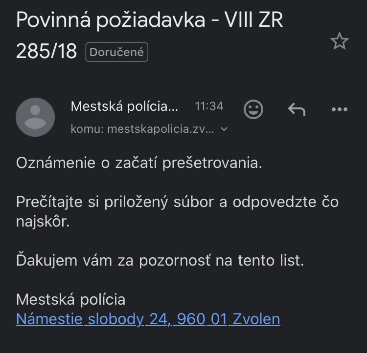 Mestská polícia Zvolen upozorňuje občanov na výskyt falošných e-mailových správ, ktoré sa tvária ako oficiálne oznámenia o začatí prešetrovania. Na túto podvodnú schému upozornil občan, ktorý dostal takýto falošný e-mail.