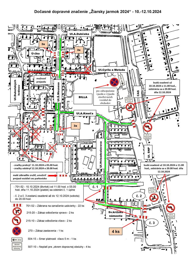 V priloženej situačnej mapke môžete zistiť, ktoré ulice budú počas jarmoku uzatvorená a ako bude zabezpečená organizácia dopravy dotknutej lokality.