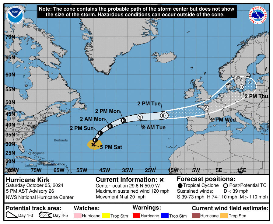 Hurikán KIRK, kategorizovaný ako hurikán 4. kategórie s rýchlosťou vetra viac ako 220 km/h, sa postupne presúva k Európe. Očakáva sa, že dorazí v stredu, pričom najväčšie problémy spôsobí v Španielsku, Francúzsku a Nemecku. Po prechode nad chladnejšími vodami Atlantiku síce hurikán zoslabne a zmení sa na post-tropický cyklón, no stále prinesie silné vetry a zrážky. Vo Francúzsku a Nemecku môžu nárazy vetra prekročiť 100 km/h, čo môže spôsobiť materiálne škody.