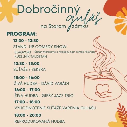 Vstup na akciu je zadarmo. V sobotu, 12. októbra si návštevníci na Starom zámku môžu kúpiť guláš, z ktorého výťažok poputuje na kúpu AED DEFIBRILÁTORA pre mesto Banská Štiavnica.