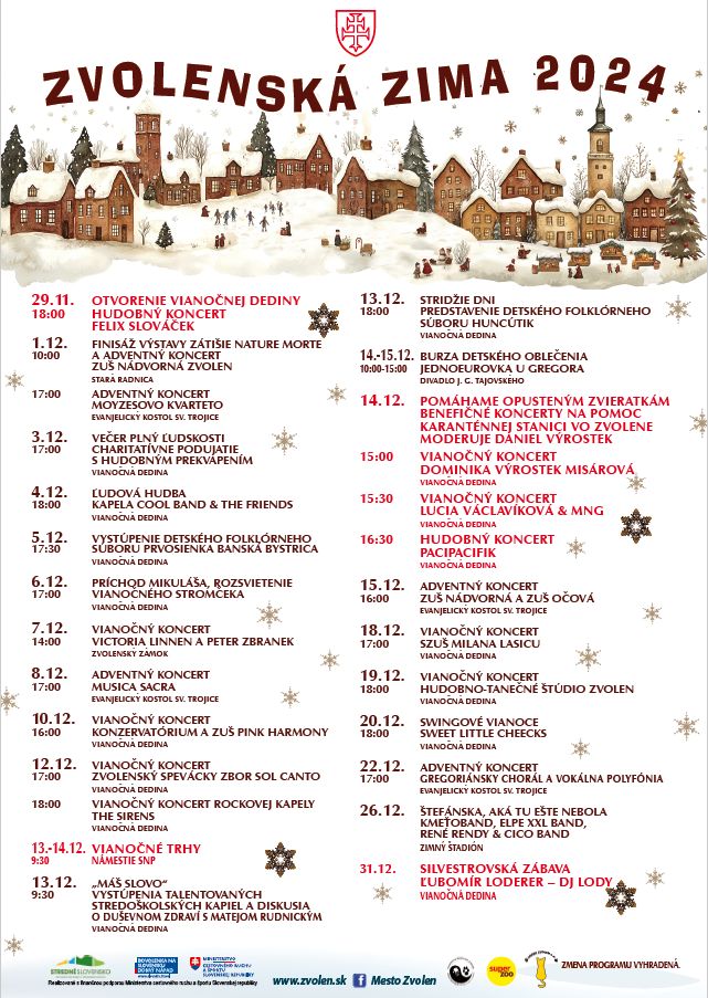 Mesto Zvolen pripravilo aj tento rok pestrý program podujatí v rámci Zvolenskej zimy 2024, ktorý prinesie sviatočnú atmosféru a kultúrne zážitky pre všetkých obyvateľov a návštevníkov. Akcie sa uskutočnia od konca novembra až do Silvestra a ponúkajú široké spektrum – od koncertov, cez tradičné vianočné trhy, až po charitatívne podujatia.