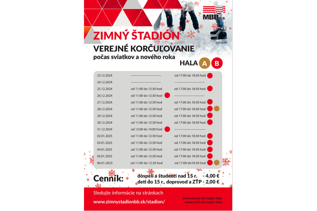 Zimný štadión je otvorený denne od 11:00 do 12:30 hod. a od 17:00 do 18:30 hod. Výnimkou sú sviatočné dni: 26. a 30. decembra bude verejné korčulovanie dostupné len v doobedných hodinách, na Štedrý deň bude zatvorené celý deň a 23. decembra bude korčulovanie sprístupnené len podvečer. Bližší prehľad si môžete pozrieť v galérii.