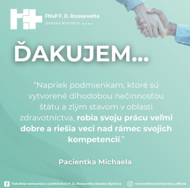 Nie každý deň sa stretávame s takým srdečným poďakovaním, aké dostala II. gynekologicko-pôrodnícka klinika Fakultnej nemocnice s poliklinikou F. D. Roosevelta v Banskej Bystrici. Pacientka Michaela, ktorá na klinike strávila štyri dni, sa rozhodla verejne vyjadriť vďaku za starostlivosť, ktorú počas hospitalizácie dostala.