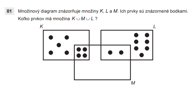 Koľko prvkov má množina K ∪ L ∪ M, ak sú znázornené bodkami v množinovom diagrame?