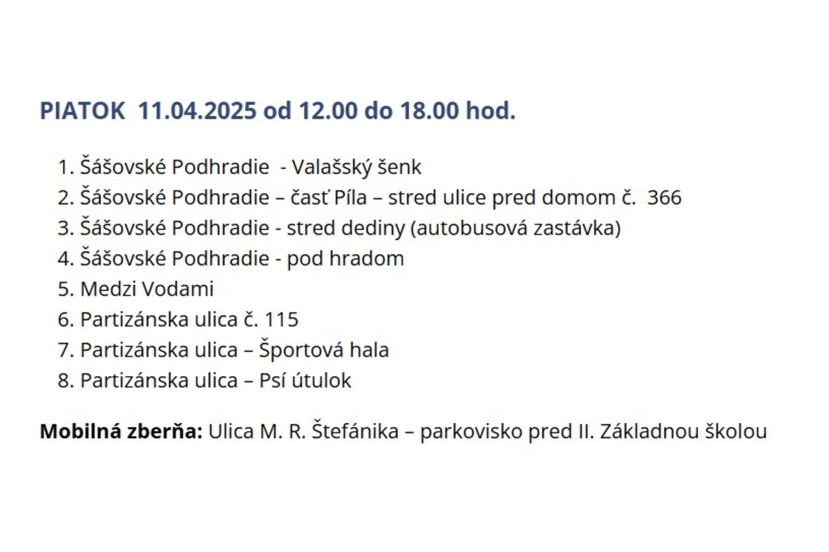 - Piatok 11. apríla: Šášovské Podhradie, Partizánska ulica, Medzi Vodami a ďalšie.