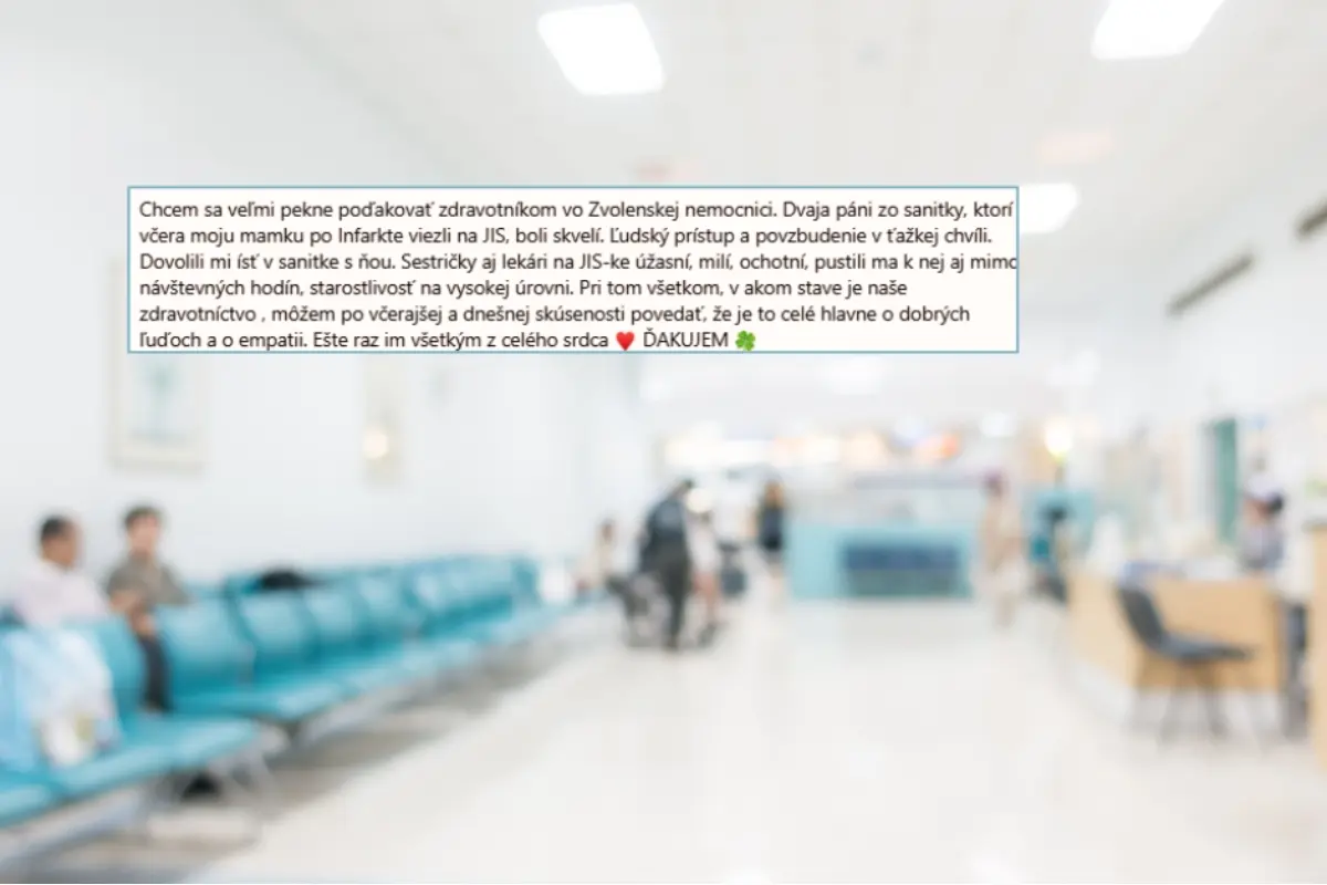 „Chcem sa veľmi pekne poďakovať zdravotníkom vo Zvolenskej nemocnici. Dvaja páni zo sanitky, ktorí včera moju mamku po infarkte viezli na JIS, boli skvelí. Ľudský prístup a povzbudenie v ťažkej chvíli. Dovolili mi ísť v sanitke s ňou. Sestričky aj lekári na JIS-ke úžasní, milí, ochotní, pustili ma k nej aj mimo návštevných hodín, starostlivosť na vysokej úrovni. Pri tom všetkom, v akom stave je naše zdravotníctvo, môžem po včerajšej a dnešnej skúsenosti povedať, že je to celé hlavne o dobrých ľuďoch a o empatii. Ešte raz im všetkým z celého srdca ĎAKUJEM," uviedla Anna na sociálnej sieti.