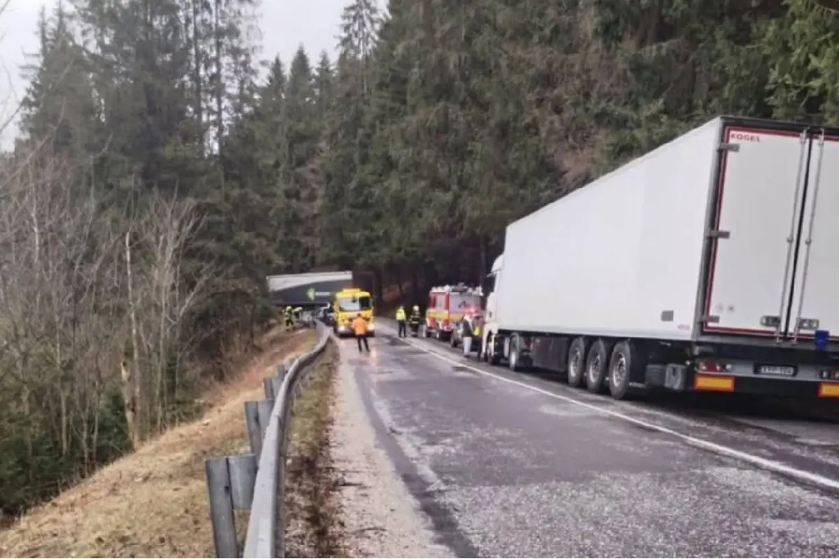 Na ceste I. triedy medzi Kremnickými Baňami a Dolným Turčekom sa zrazil kamión s autom. Úsek je neprejazdný