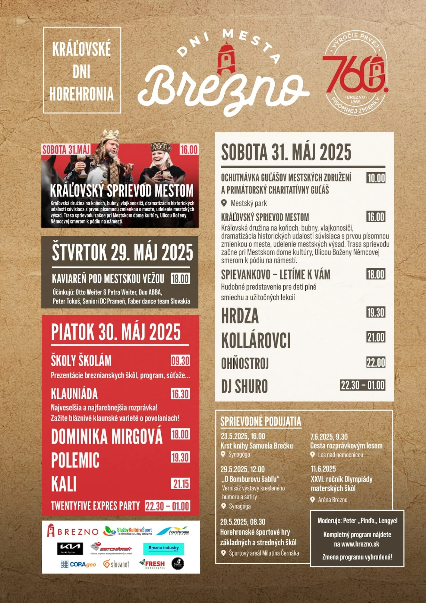 Dni mesta Brezno budú v tomto roku budú výnimočné aj vďaka sprievodu mestom v sobotu o 16:00. Kráľovská družina na koňoch v podaní historickej skupiny povedie všetkých účastníkov sprievodu od domu kultúry Ulicou Boženy Němcovej smerom k mestskému úradu a odtiaľ na námestie. Tam bude program pokračovať dramatizáciou historických udalostí súvisiacich s prvou písomnou zmienkou o meste.