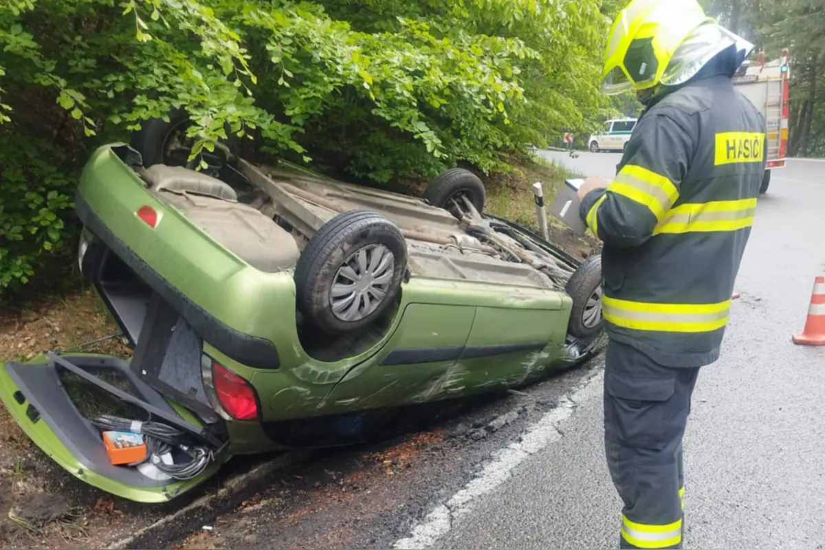 FOTO: Na Čertovici došlo k nehode, auto skončilo prevrátené na streche mimo cesty