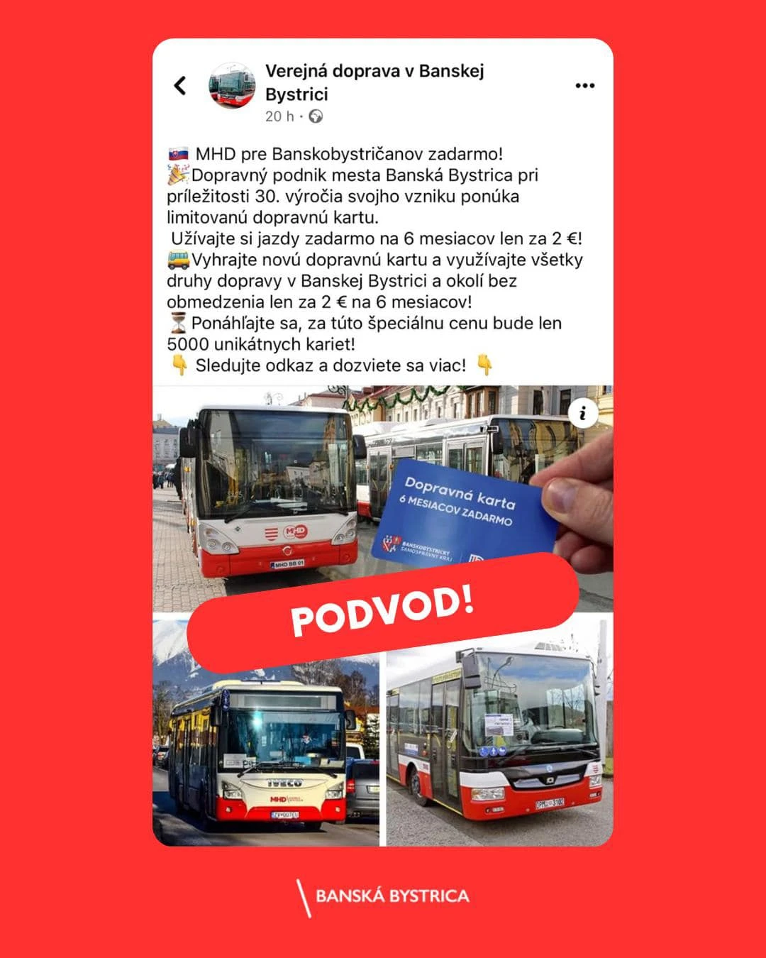 „MHD pre Banskobystričanov zadarmo! Dopravný podnik mesta Banská Bystrica pri príležitosti 30. výročia svojho vzniku ponúka limitovanú dopravnú kartu. Užívajte si jazdy zadarmo na 6 mesiacov len za 2 €! Vyhrajte novú dopravnú kartu a využívajte všetky druhy dopravy v Banskej Bystrici a okolí bez obmedzenia len za 2 € na 6 mesiacov! Ponáhľajte sa, za túto špeciálnu cenu bude len 5000 unikátnych kariet!“ píše sa v podvodnom príspevku.