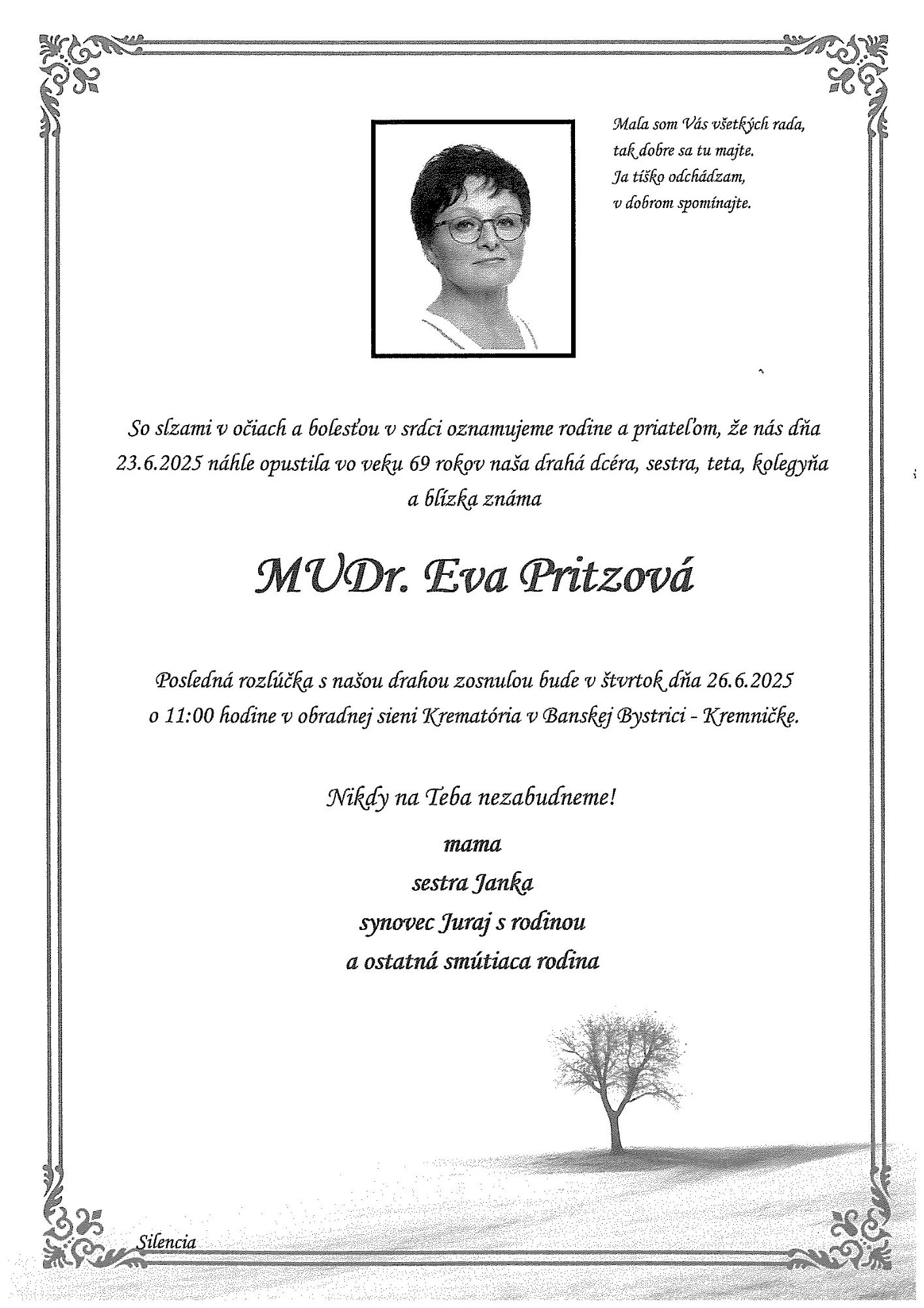 kObyvatelia Banskej Bystrice a okolia prišli o obľúbenú lekárku Evu Pritzovú, ktorá bola odborníčka v oblasti onkológie a rádioterapia. Od júna 2016 pracovala v AGEL Mammacentre sv. Agáty v Banskej Bystrici. Zomrela náhle vo veku 69 rokov.