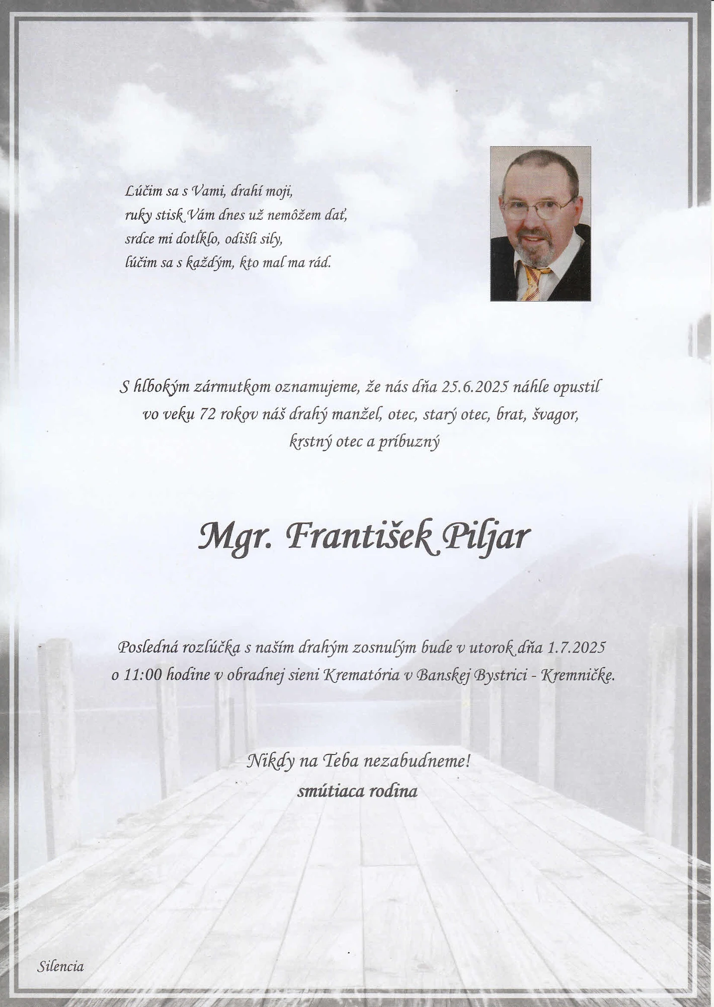 Máloktorý súčasný autor dokáže tak hlboko a zároveň citlivo vniknúť do duše človeka ako František Piljar. Medzi jeho najznámejšie diela patria Obruče, Návrat, Len smrť nás prežije, Chrám skazy či Skrotený na neurčito. Posledná rozlúčka sa uskutoční v utorok o 11:00 hod. v obradnej sieni Krematória v Kremničke.