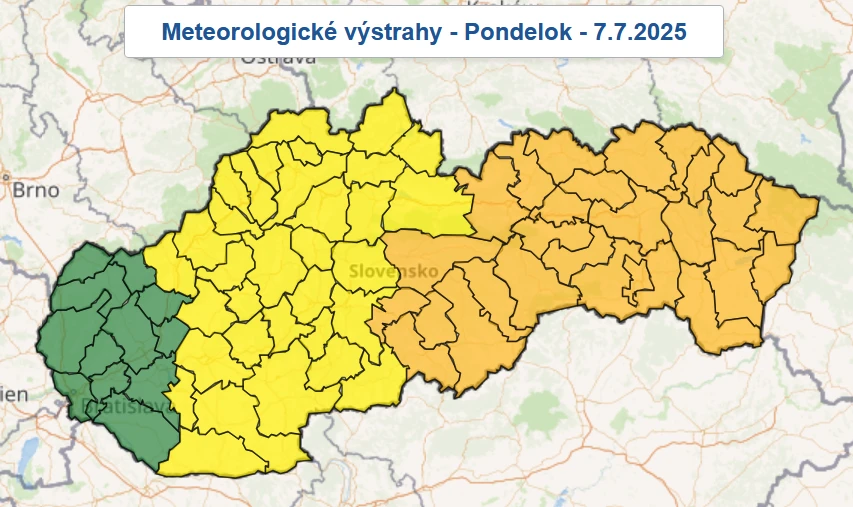 Výstrahy druhého stupňa pred búrkami platia pre okresy Brezno, Lučenec, Poltár, Rimavská Sobota, Detva a Revúca. „V okresoch sa očakávajú búrky spojené s prudkým lejakom s intenzitou 30 - 40 mm / 30 min, s nárazmi vetra 20 - 30 m/s (70 - 110 km/h). Padať môžu aj krúpy s priemerom aj okolo 2 centimetrov,“ varujú meteorológovia.