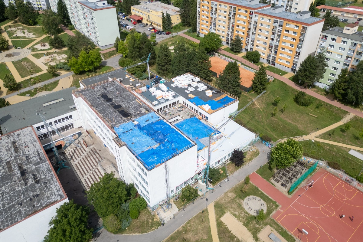 „V závere minulého týždňa sa podarilo v celom rozsahu odstrániť pôvodné vrstvy strešného plášťa na pavilóne D1 a približne polovicu strechy na pavilóne C. Na zázemí telocvične, šatní, dielní, autoškoly a ZUŠky už bola čiastočne položená nová tepelná izolácia a hydroizolačná vrstva. Staré svetlíky nahradili nové a práce každým dňom napredujú,“ priblížil primátor.