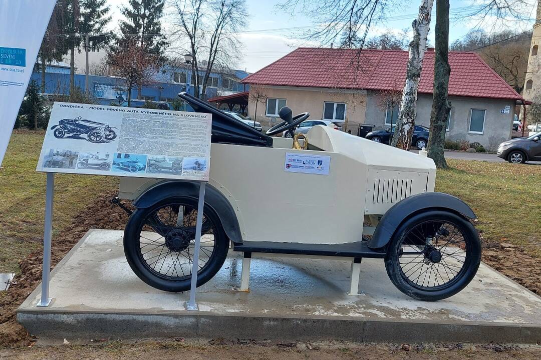 V obci Hronský Beňadik nedávno slávnostne odhalili repliku legendárneho kabrioletu. Takzvaná Drndička bola zároveň prvým slovenským autom. Autorkou súčasného modelu je umelecká kováčka Andrea Kosecová, ktorá ho vyhotovila v spolupráci so svojím otcom a bratom.