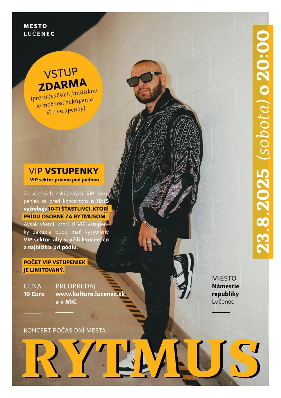 „Tento koncert bude plný emócií, energie a jedinečnosti. Nepremeškajte unikátnu príležitosť zažiť tento koncert naživo v našom meste. Pre tých najväčších fanúšikov je možnosť zakúpenia VIP vstupenky v cene 10 eur. Pred koncertom sa vyžrebujú 10 šťastlivci, ktorí prídu do zákulisia za Rytmusom. Zo všetkých zakúpených vstupeniek sa pred koncertom o 19:15 vyžrebujú 10 šťastlivci, ktorí prídu do zákulisia a stretnú sa s Rytmusom. Avšak všetci, ktorí si VIP vstupenky zakúpia, budú mať vytvorený VIP sektor, aby si užili koncert čo najbližšie pri pódiu,“ priblížilo mesto na svojom webe.