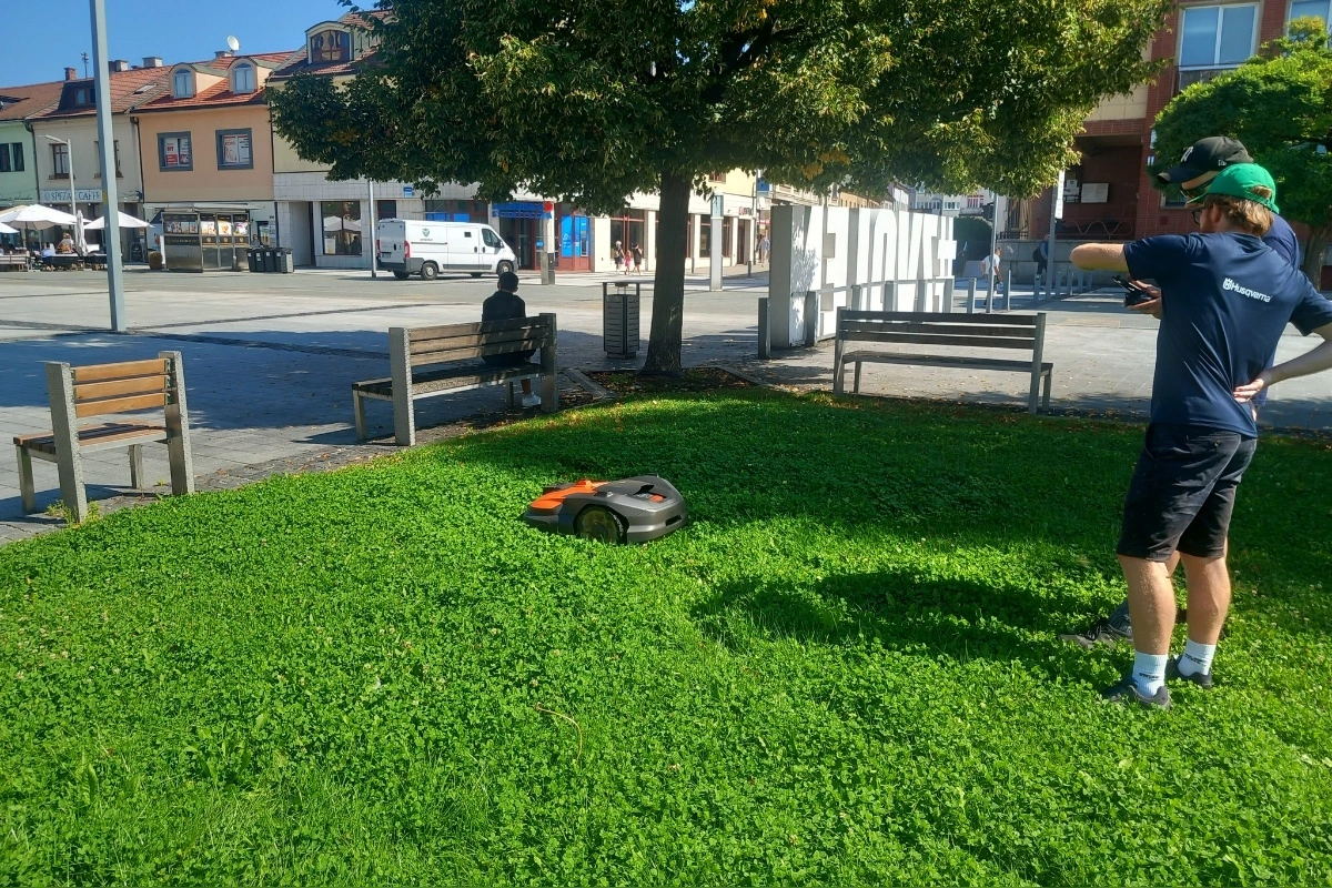 FOTO: Na námestí vo Zvolene už kosí robotická kosačka, menším deťom však pracovníci posielajú varovanie