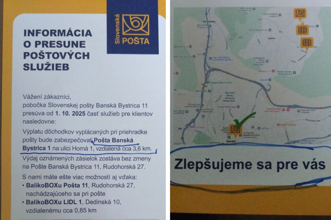 Pobočka Slovenskej pošty Banská Bystrica 11 na Rudohorskej 27 presúva od 1. októbra časť služieb klientov. Výplatu dôchodkov vyplácaných pri priehradke pošty bude zabezpečovať Pošta 1 na ulici Horná 1, ktorá je vzdialená približne 3,6 kilometra. Výdaj oznámených zásielok ostane bez meny.