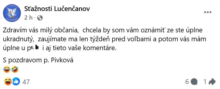Na sociálnej sieti sa objavil status, ktorý mal vzbudzovať dojem, že jeho autorkou bola primátorka mesta Lučenec Alexandra Pivková. Píše sa v ňom, že sú jej obyvatelia a zaujímajú ju len týždeň pred voľbami. Ide však o podvodný príspevok, ktorého autor je neznámy. Dištancovala sa od neho aj samotná primátorka.