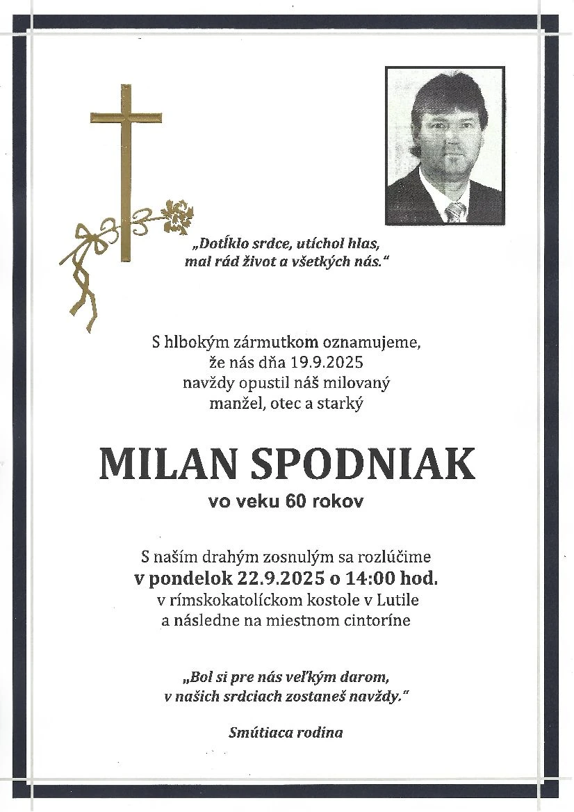 Obec Lutila pri Žiari nad Hronom a miestny futbalový klub zasiahla smutná správa. V sobotu vo veku 60 rokov zomrel Milan Spodniak, dlhoročný hráč a bývalý tréner OŠK Lutila: „Vyjadrujeme úprimnú sústrasť celej rodine. Opustil nás náš bývalý dlhoročný hráč a bývalý tréner. Odpočívaj v pokoji,“ uviedol klub OŠK Lutila.