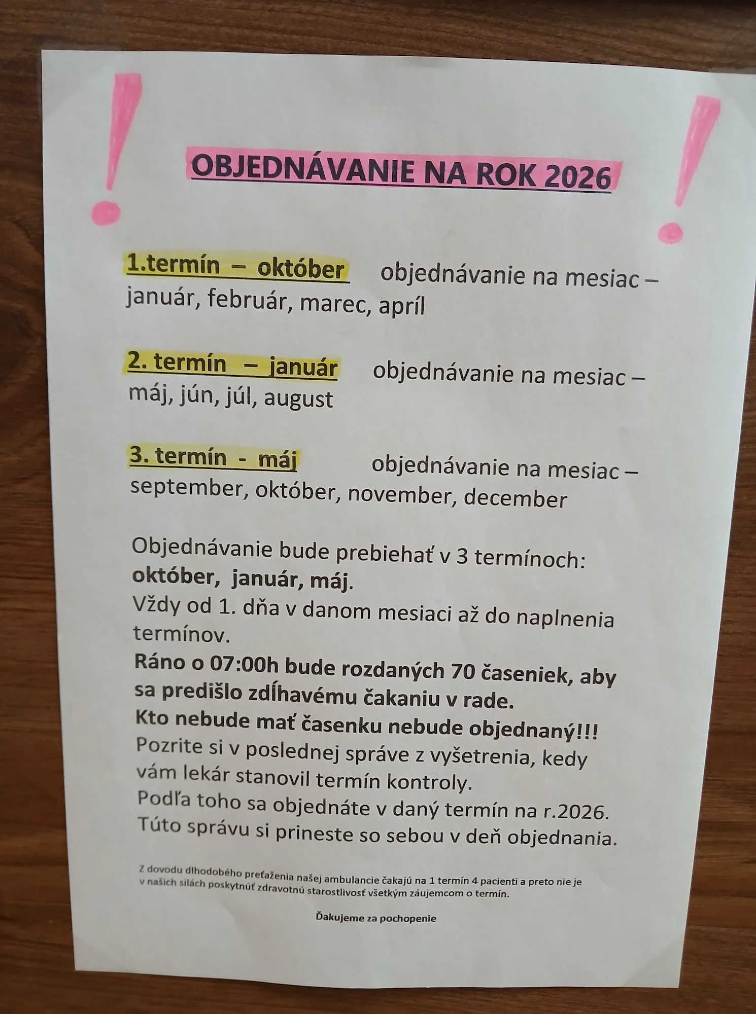 Miroslav zdieľal oznam lekárky, v ktorom vysvetľuje postup. Práve dnes totižto prebieha objednávanie na január až apríl, neskôr v roku sa bude dať objednať aj na ďalšie mesiace. „Ráno o 7:00 bude rozdaných 70 časeniek, aby sa predišlo zdĺhavému čakaniu v rade. Kto nebude mať časenku, nebude objednaný,“ píše sa v ozname.