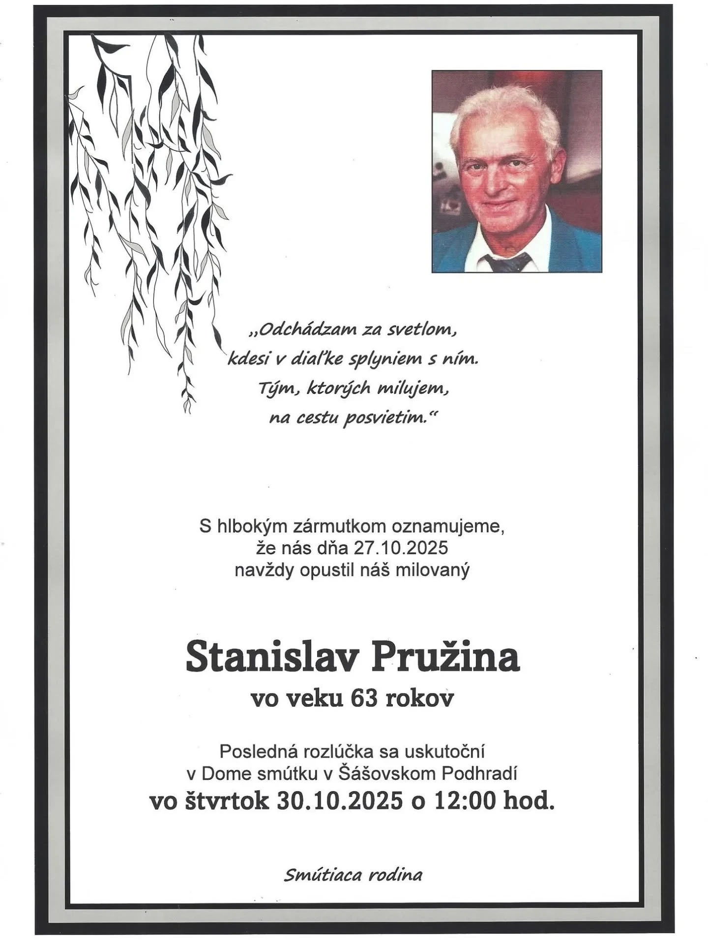 Posledná rozlúčka so zosnulým sa uskutoční vo štvrtok v Dome smútku v Šášovskom Podhradí. Na internete vyjadrili úprimnú sústrasť viacerí ľudia.