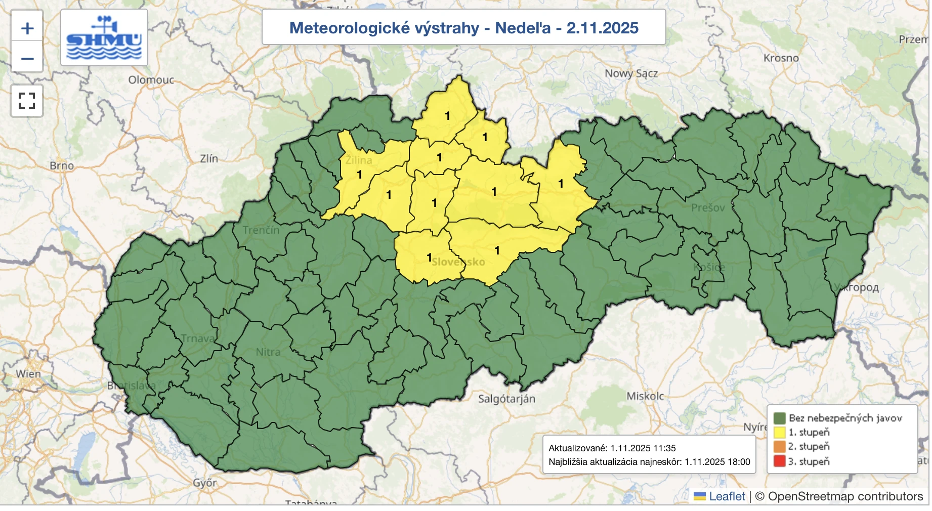 Podľa meteorológov sa vo vyšších polohách nad približne 1 500 metrov očakávajú nárazy vetra s rýchlosťou 110 až 120 kilometrov za hodinu a priemerná rýchlosť vetra môže dosahovať 70 až 85 kilometrov za hodinu. Výstraha platí od soboty 1. novembra od 19:00 hod. Situácia bude pretrvávať aj v noci z nedele na pondelok.