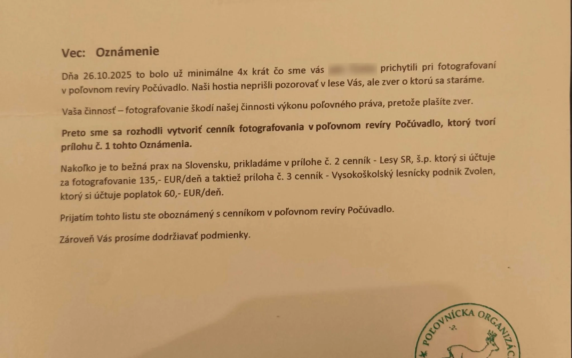 Roman dostal nečakaný list od poľovníkov z revíru Počúvadlo v okrese Lučenec. Píše sa v ňom, že pri fotografovaní plaší zver a preto mu posielajú nový cenník. „Dňa 26.10.2025 to bolo už minimálne 4x, čo sme vás prichytili pri fotografovaní v poľovnom revíri Počúvadlo. Naši hostia neprišli pozorovať v lese Vás, ale zver, o ktorú sa staráme,“ napísala poľovnícka organizácia s tým, že fotografovanie škodí jej činnosti výkonu poľovného práva.
