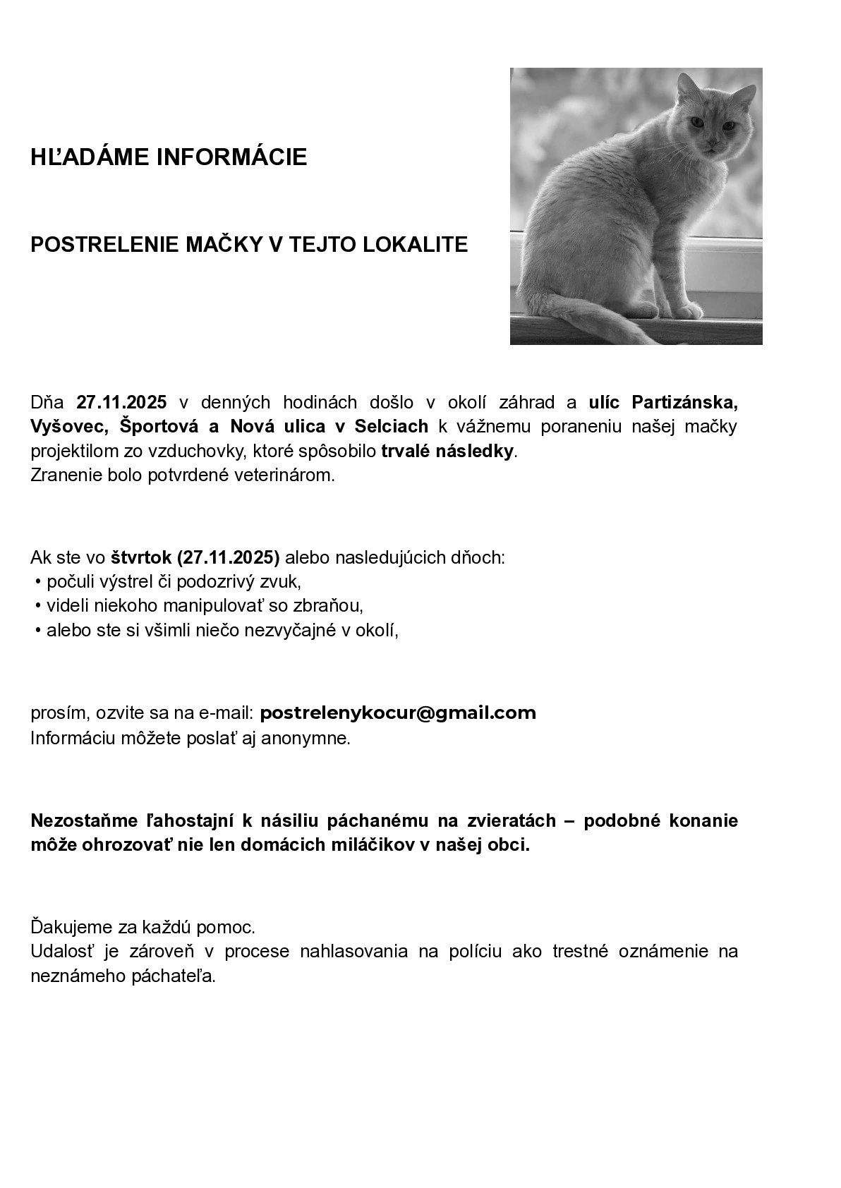 V Selciach pri Banskej Bystrici došlo 27. novembra v oblasti ulíc Partizánska, Vyšovec, Športová a Nová ulica k vážnemu incidentu, ktorý otriasol majiteľmi domácich miláčikov aj celou obcou. Neznámy páchateľ tam postrelil mačku projektilom zo vzduchovky, pričom zranenie potvrdil aj veterinár. Strela spôsobila trvalé následky.